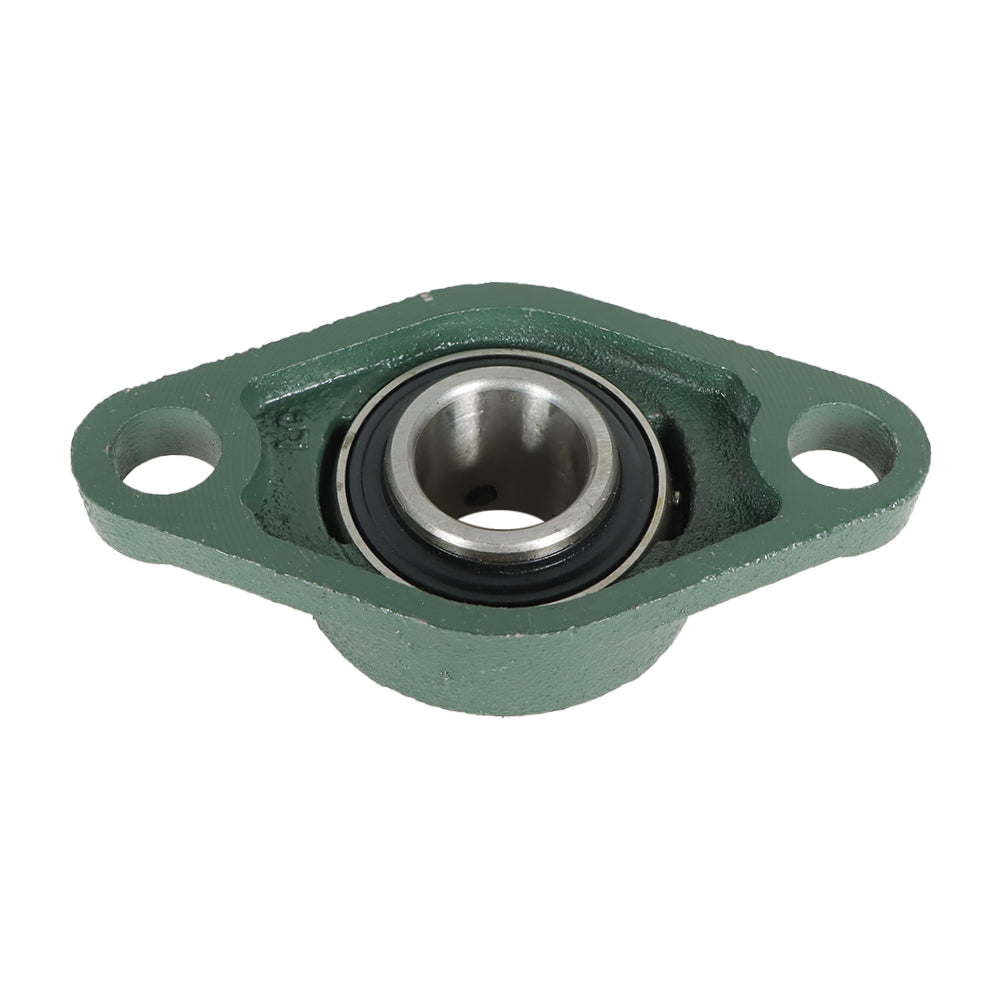 - The UCFL pillow block mounted bearing series has two bolt holes, and a set screw lock is designed for mounting onto bearing surfaces parallel to the shaft axis, such as conveyor belts. This ready-to-mount unit has solid base cast iron housing, chrome steel bearings, and is designed for efficient operation at a wide range of speeds. This one-piece pillow block housing allows for a stationary outer ring and rotating inner ring. Insert bearing maintains the separation between moving parts to reduce rotational friction, and to support radial and axial loads. The bearing is secured to the shaft with set screws to prevent slippage. This mounted bearing is used in food and beverage manufacturing, textile industry and many other industrial manufacturing.