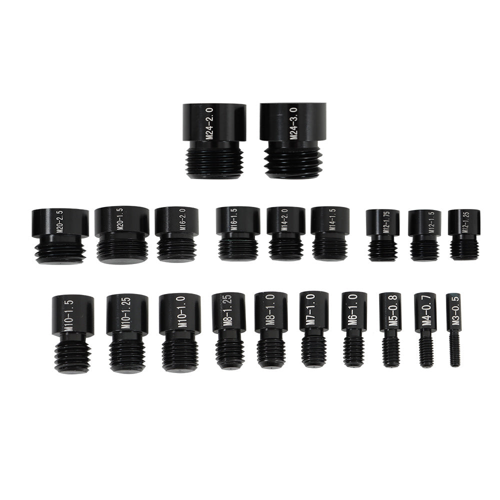 M3x0.5, M4x0.7, M5x0.8, M6x1.0, M7x1.0, M8x1.0, M8x1.25, M10x1.0, M10x1.25, M10x1.5, M12x1.25, M12x1.5, M12x1.75, M14x1.5, M14x2.0, M16x1.5, M16x2.0, M20x1.5, M20x2.5, M24x2.0 and M24x3.0.