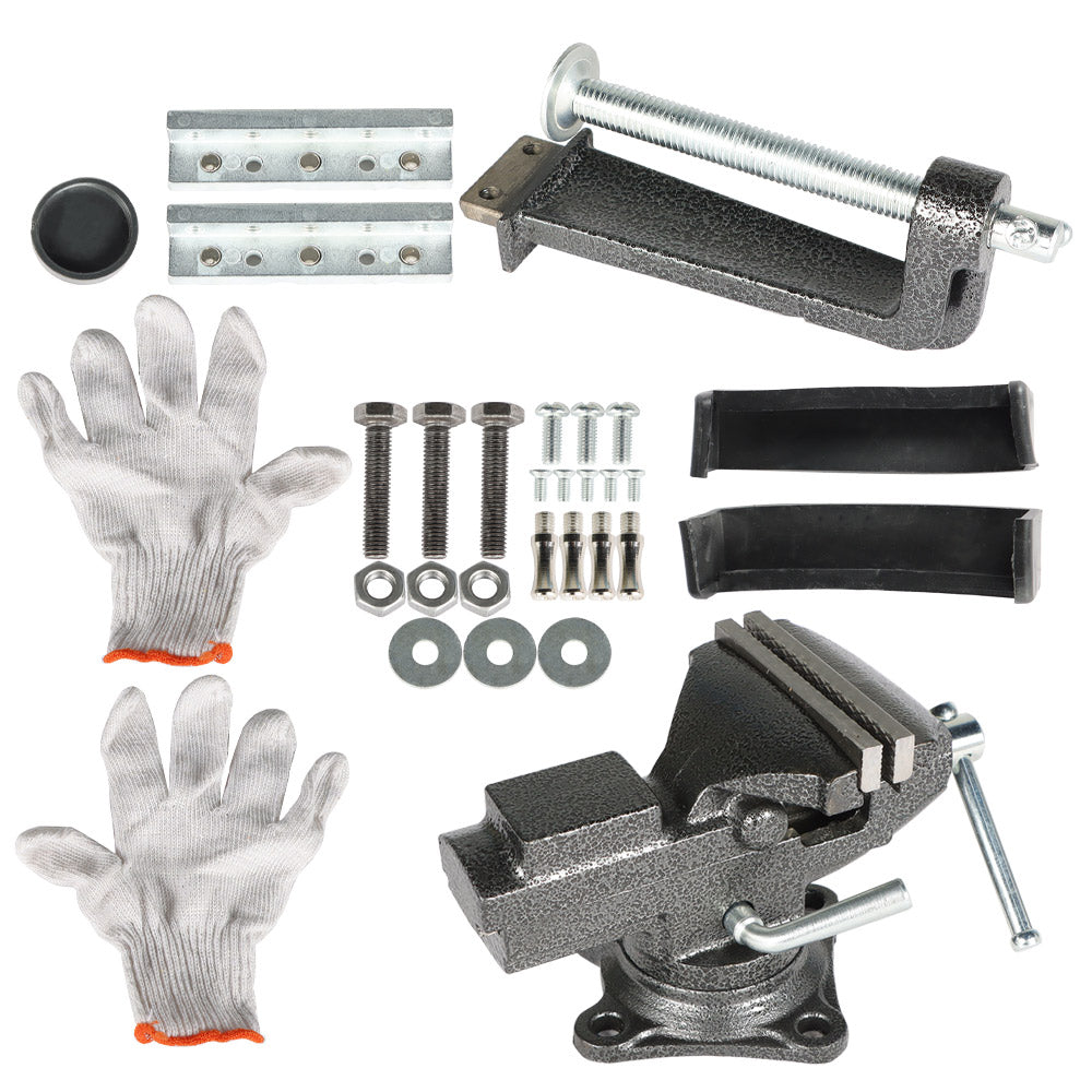 UNIVERSAL TABLE VISE : Net weight 5 lbs, Maximum opening of jaw is up to 2.44'', jaw width 3.3''. Made of high-grade cast steel - The surface is sprayed to enhance corrosion-resistance and to make it more smooth to the touch. The jaw is hardened and hammered to increase its hardness and strength, providing long-lasting durability and reliable grip.
