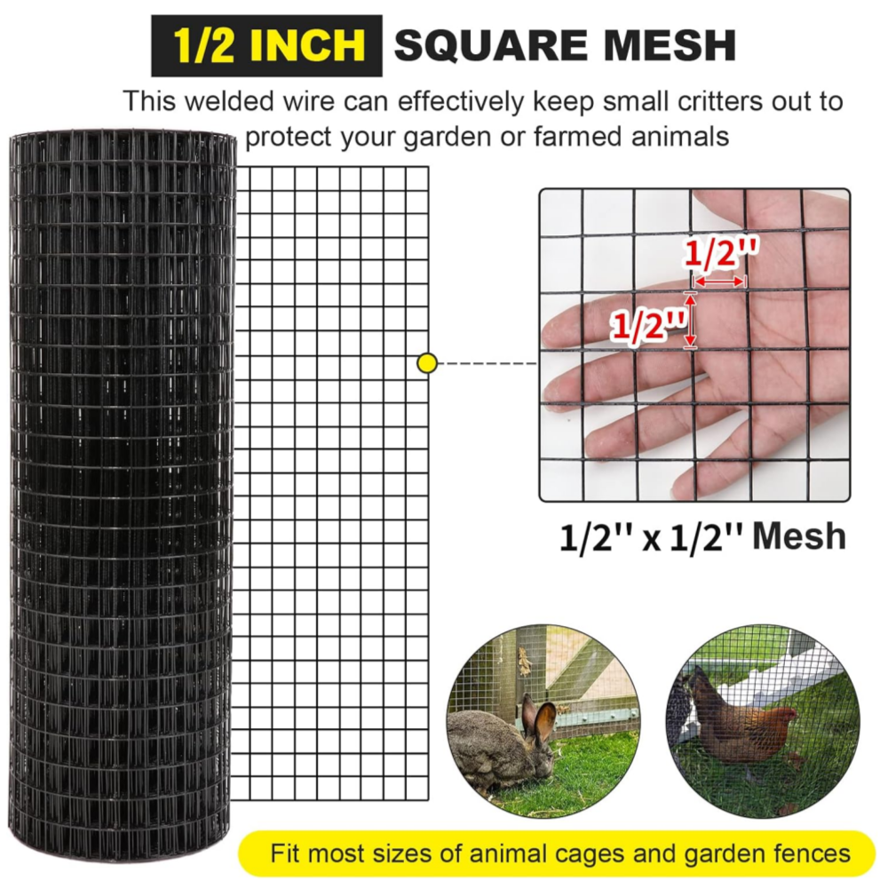 【1/2In Inch Square Mesh】With 1/2In-Inch Mesh, This Welded Wire Can Effectively Keep Small Critters Out To Protect Your Garden Or Farmed Animals. This Flexible Wire Mesh Roll Can Be Used For A Variety Of Home And Garden Projects, Such As Snake Fence, Rabbit Wire Fencing, Chicken Coop Wire, Duck Pen, Can Also Be Used To Keep Your Garden Flower Bed, Garden Fences, Vegetable Garden, Grape Vines, Farm Field And Landscape Safe From Animals.