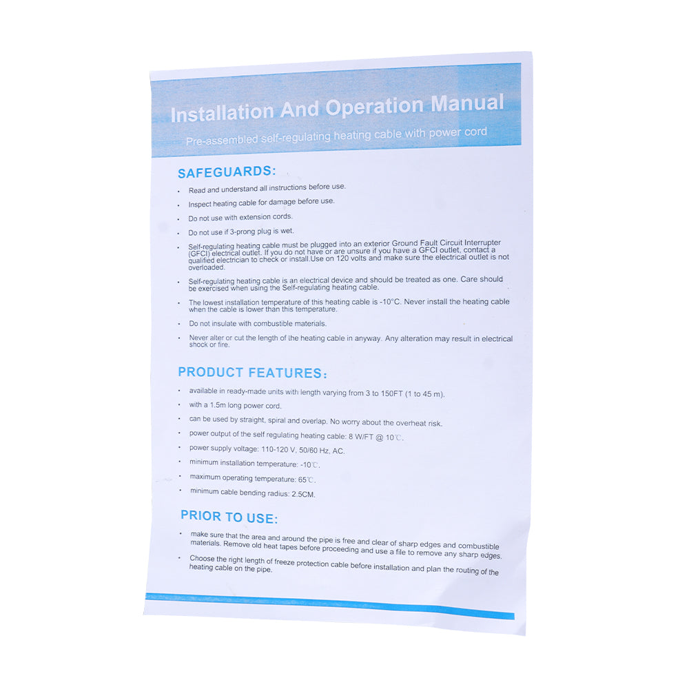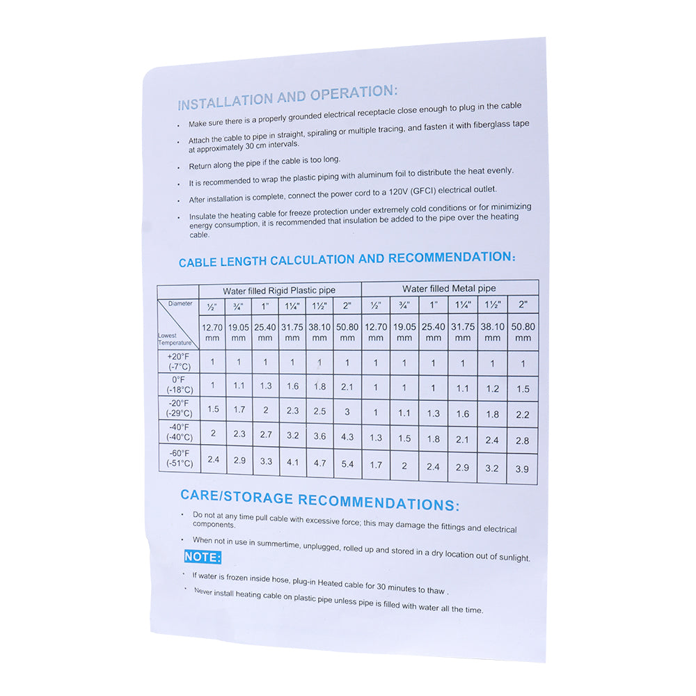 1.Easy Installation: This Water Pipe Heat Cable Is Pre-Assembled And Ready To Install. This Heat Tape For Pipes By Yourself By Following The 5-Steps Instruction. (If You Want To Test Before Installation, Please Test At A Temperature Under 0°C (32°F)).