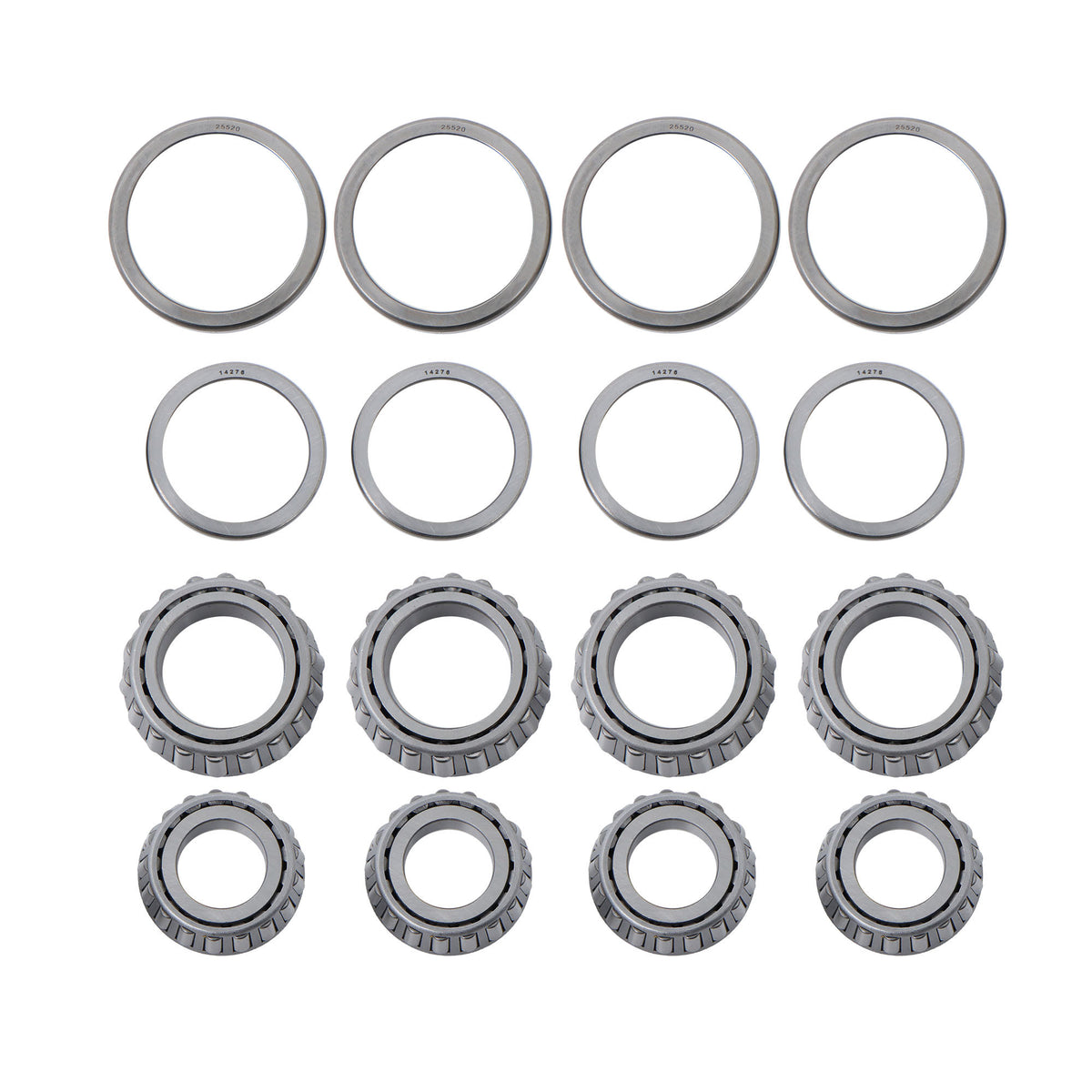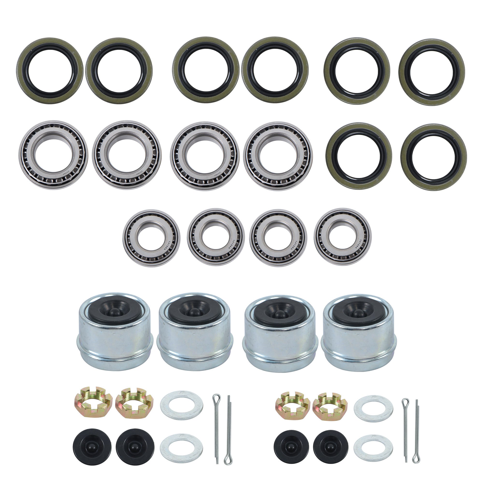 -【LUXURY KIT】This trailer hub bearings kit includes 4 SETS,all repair parts total 44PCS accessories. 4PCS Bearings (25580/25520),4PCS Bearings (14125A/14276),4PCS Grease Seals 10-36 (22333TB, Spindle D42, 2.250" x 3.376") ,4PCS Grease Seals 10-10 (21333TB, Spindle D42, 2.125" x 3.376") ,4PCS Spindle Nuts, 4PCS Washers, 4PCS Cotter Pins, 4PCS Dust Caps (2.72''), 4PCS Rubber Plugs. Meet the need for multiple repairs at a tenth of the price of buying locally.