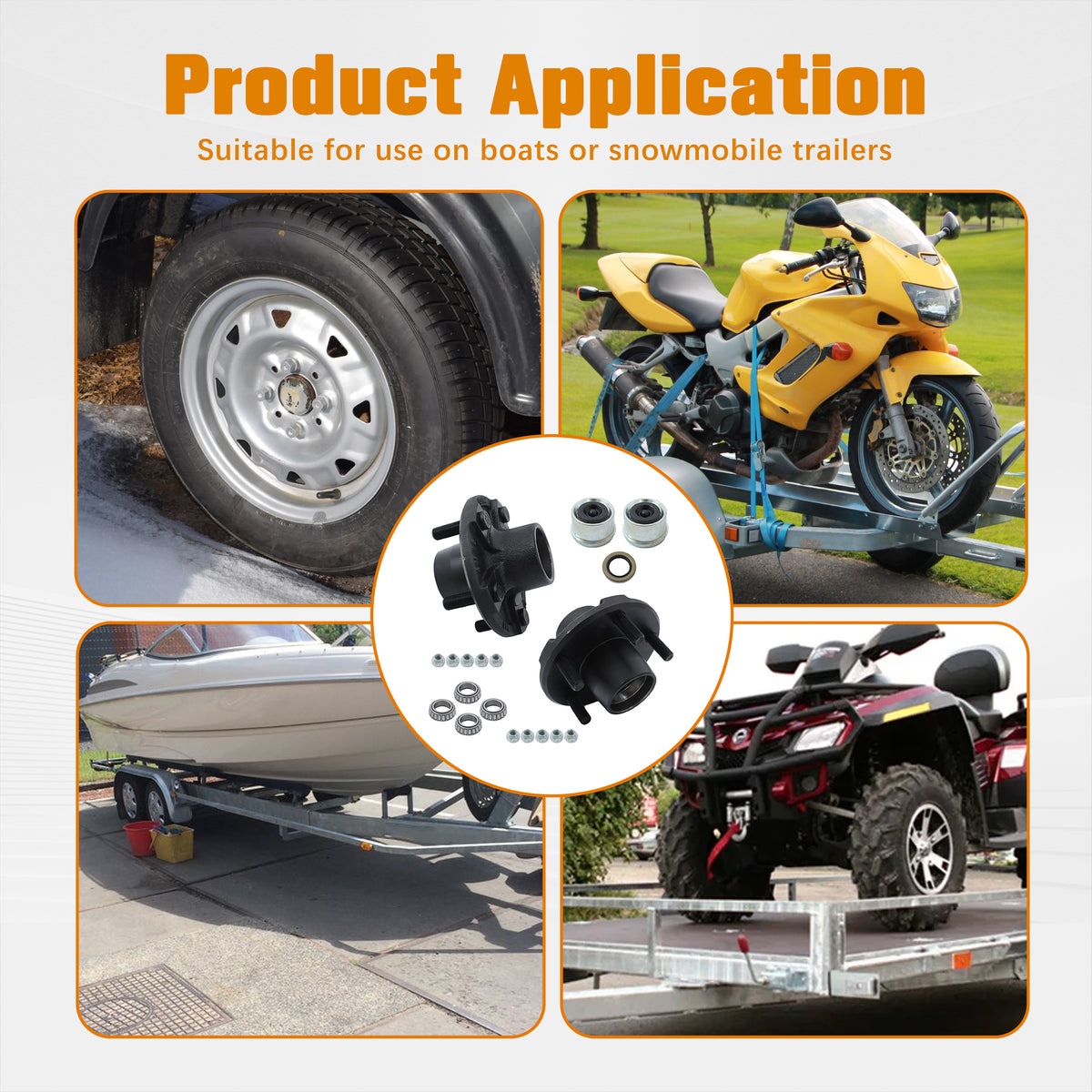 Marine grade wheels are designed for trailer idler axles. Suitable for 2000 lb shafts with 1-1/16" spindles. Includes inner bearing (L44649) and seat ring, outer bearing (L44649) and seat ring, oil seal, oil cap and nut.