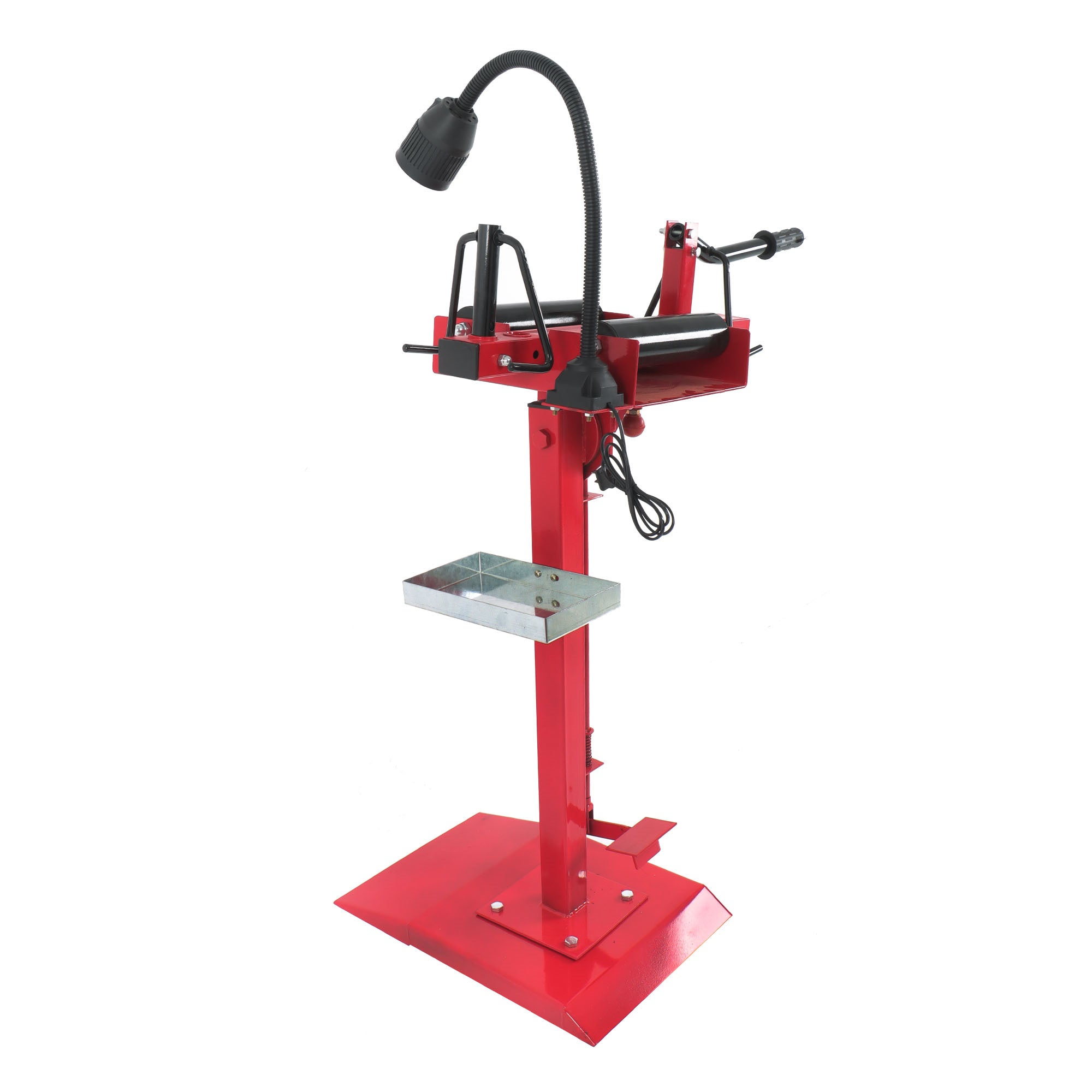 This Tires Changer/Spreader (with a working light) is designed for tire fixing spreading when repairing car tires. The available operations include tire inspecting, cutting, buffing, dust suctioning, tubes, and patching. The wider platform offers a more stable work surface. It all makes the repairing work more quickly and conveniently.